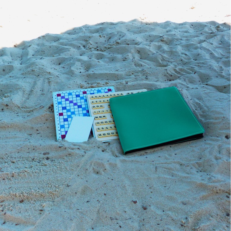 Jeu de Scrabble petit format magnétique avec une housse standard de protection en simili cuir.